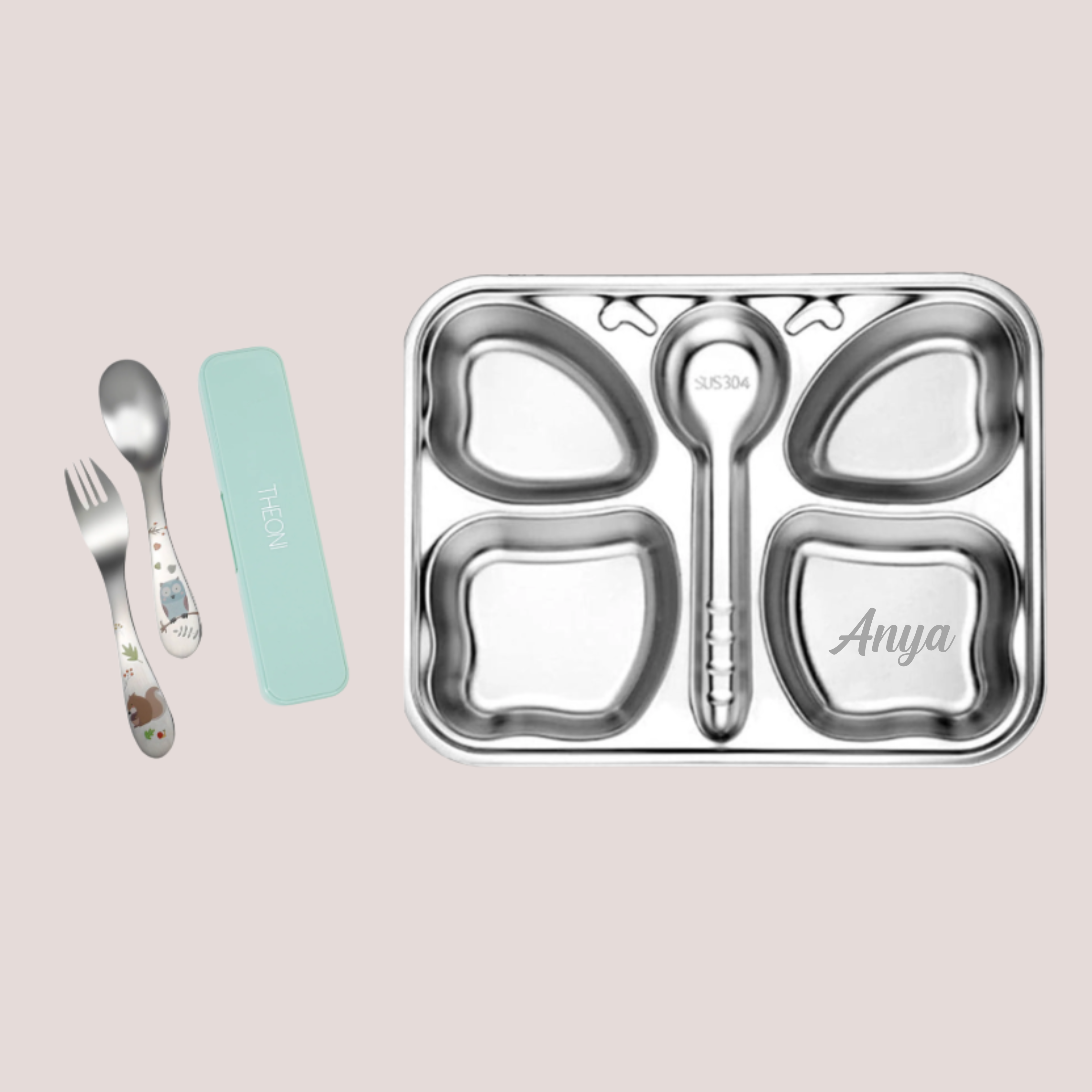THEONI Divided Meal Plate Tray - Make mealtime magical with our Butterfly-Shaped Stainless Steel Kids Plate with Cutlery Set! Featuring deep compartments, this durable plate keeps foods separate and encourages your child to try new flavors.