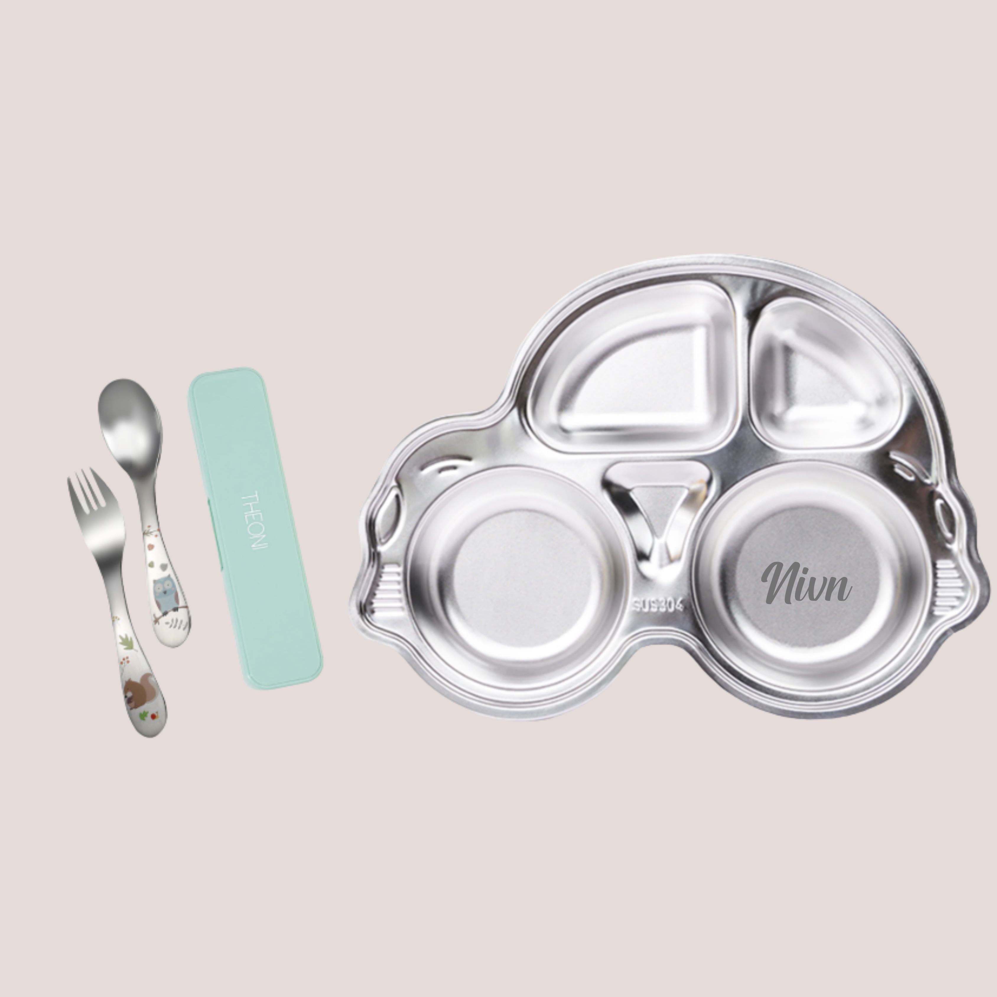 THEONI Divided Meal Plate Tray - Make mealtime a thrilling race with our Car-Shaped Stainless Steel Kids Plate with Cutlery Set! Designed with deep compartments, this durable plate keeps food neatly separated, making every meal more fun and engaging for kids.