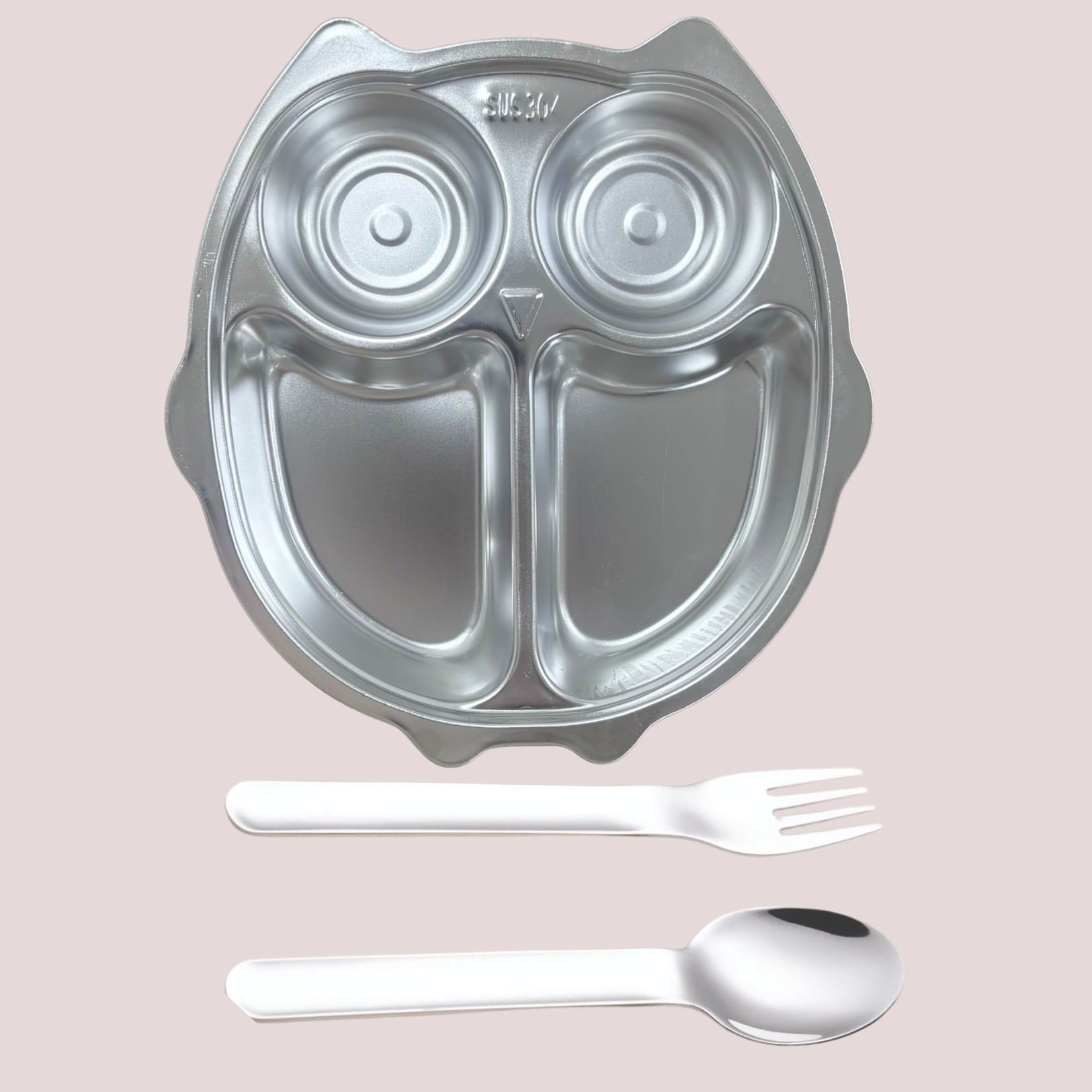 THEONI Divided Meal Plate Tray - Make mealtime a hoot with our Owl-Shaped Stainless Steel Kids Plate with Cutlery Set! Featuring deep compartments, this adorable plate keeps different foods separate, encouraging your child to explore new flavors and textures.
