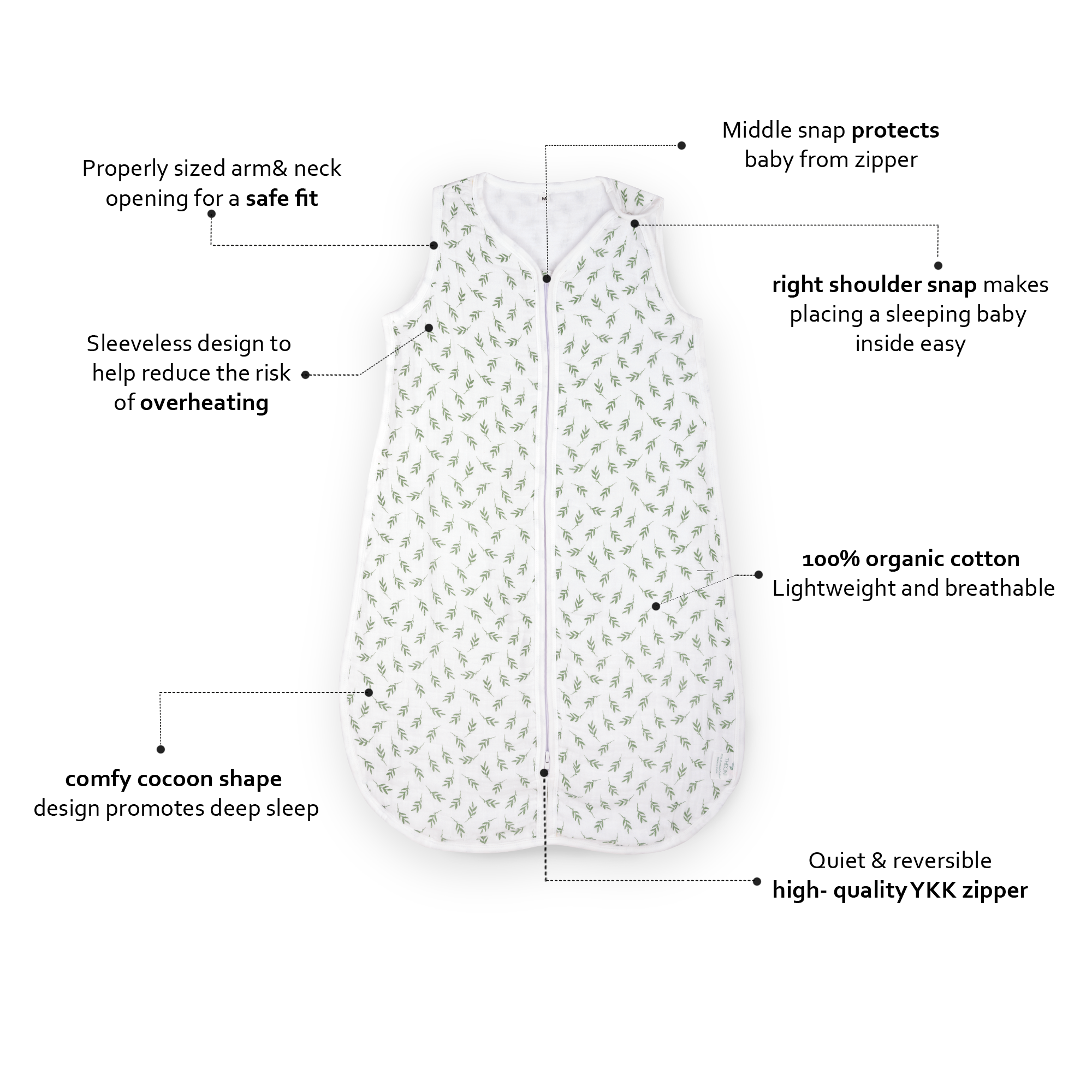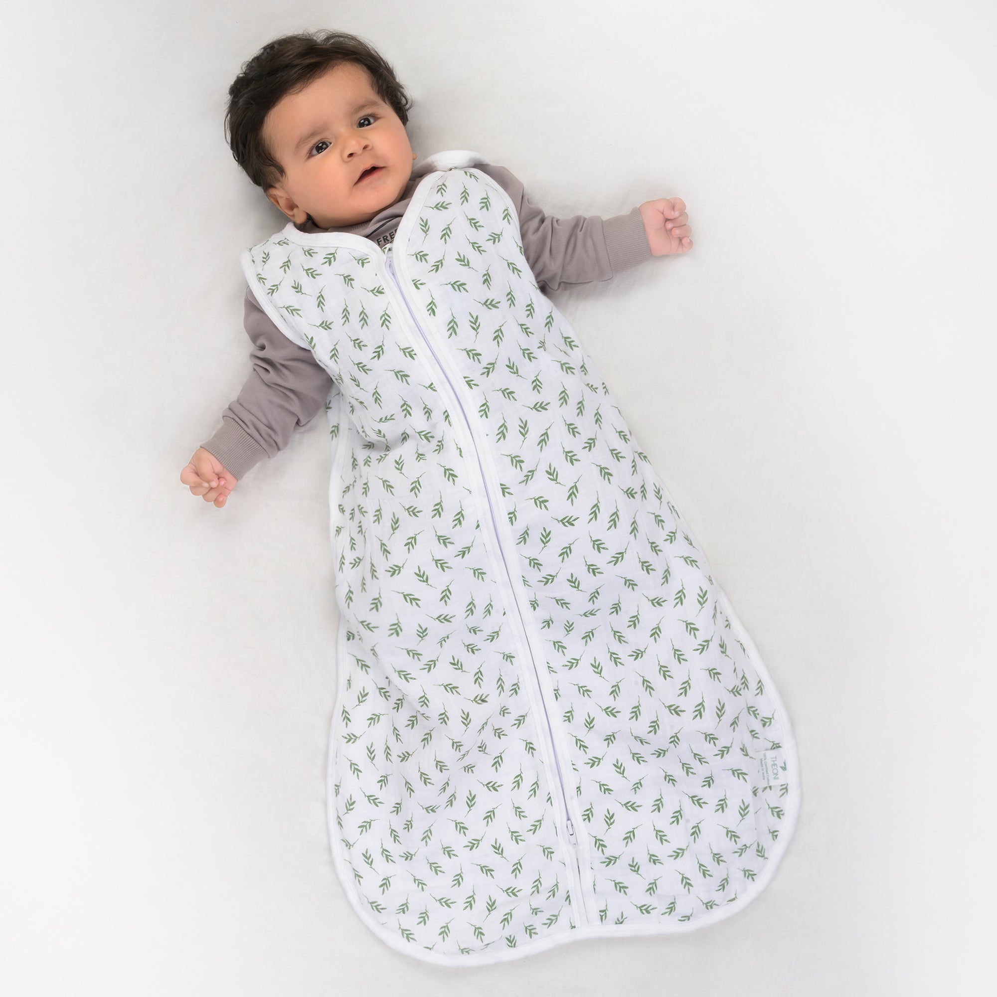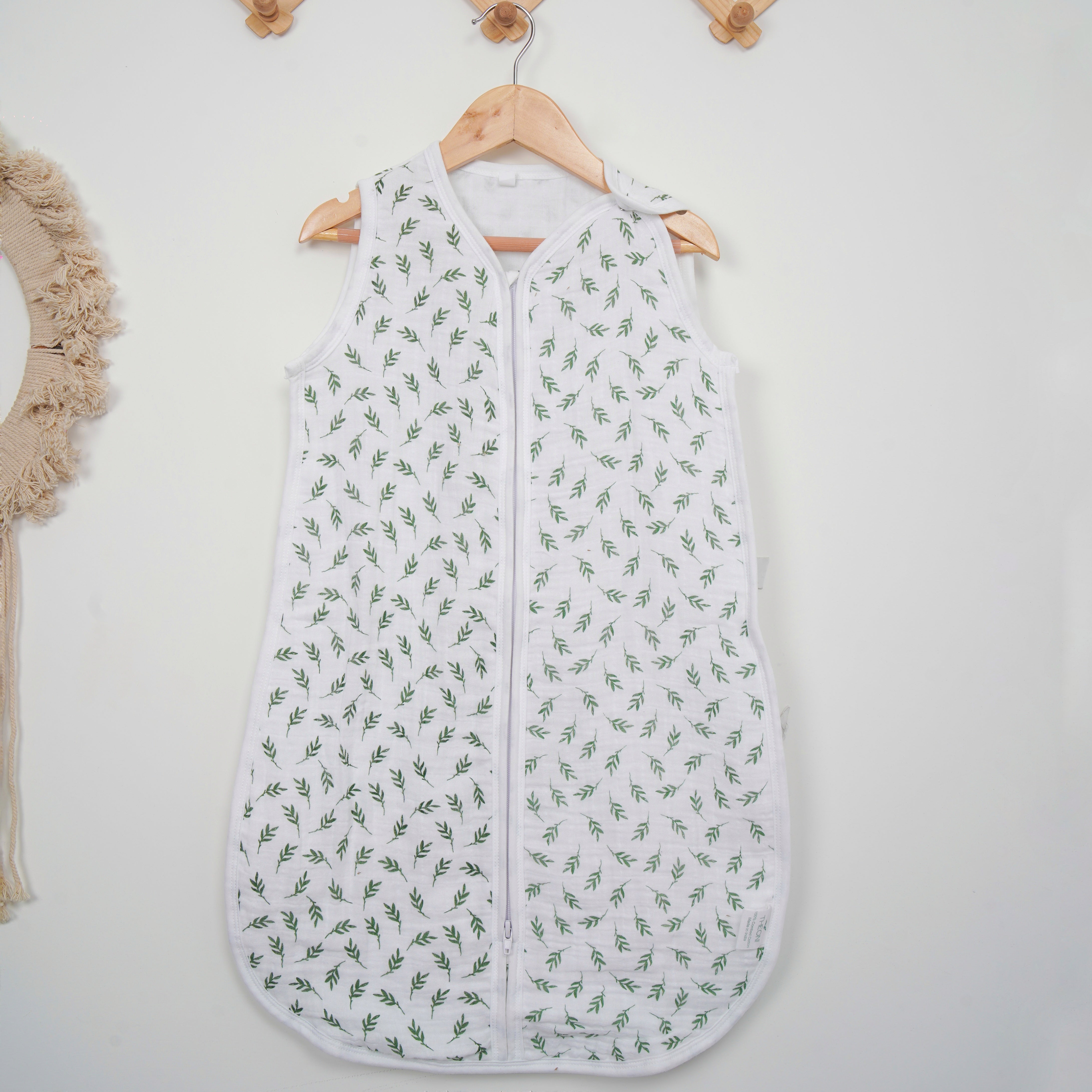 Theoni’s baby sleeping bags are “wearable blankets” designed for babies to be used instead of traditional blankets and sheets. Featuring the elegant Hedge Green Leaf pattern, Our Baby Sleep Bags can be worn by the baby to help stay at the right temperature through the night without the problem of blankets and sheets being kicked off or getting tangled up. They are eco-friendly and organic to give complete comfort and care to your little one and appropriate uninterrupted day and night sleep. Available in different sizes to suit your growing baby, the cute wearable blankets provides ample space inside the bag with a super-soft feel. This muslin sleeping sack cum wearable blankets ideal for newborn babies too.