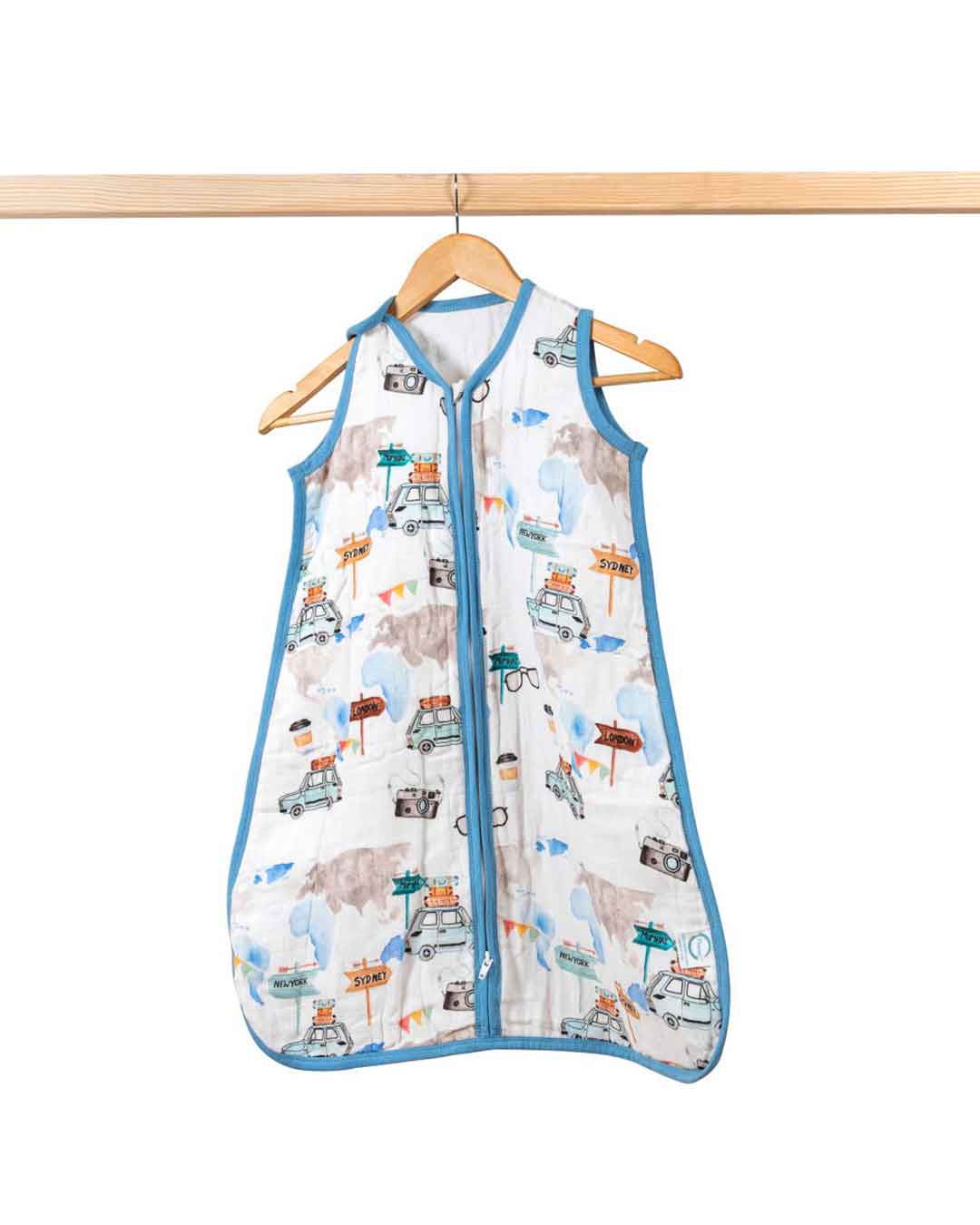 Theoni’s baby sleeping bags are “wearable blankets” designed for babies to be used instead of traditional blankets and sheets. Featuring the elegant Wanderlust Wonders pattern, Our Baby Sleep Bags can be worn by the baby to help stay at the right temperature through the night without the problem of blankets and sheets being kicked off or getting tangled up. They are eco-friendly and organic to give complete comfort and care to your little one and appropriate uninterrupted day and night sleep. Available in different sizes to suit your growing baby, the cute wearable blankets provides ample space inside the bag with a super-soft feel. This muslin sleeping sack cum wearable blankets ideal for newborn babies too.