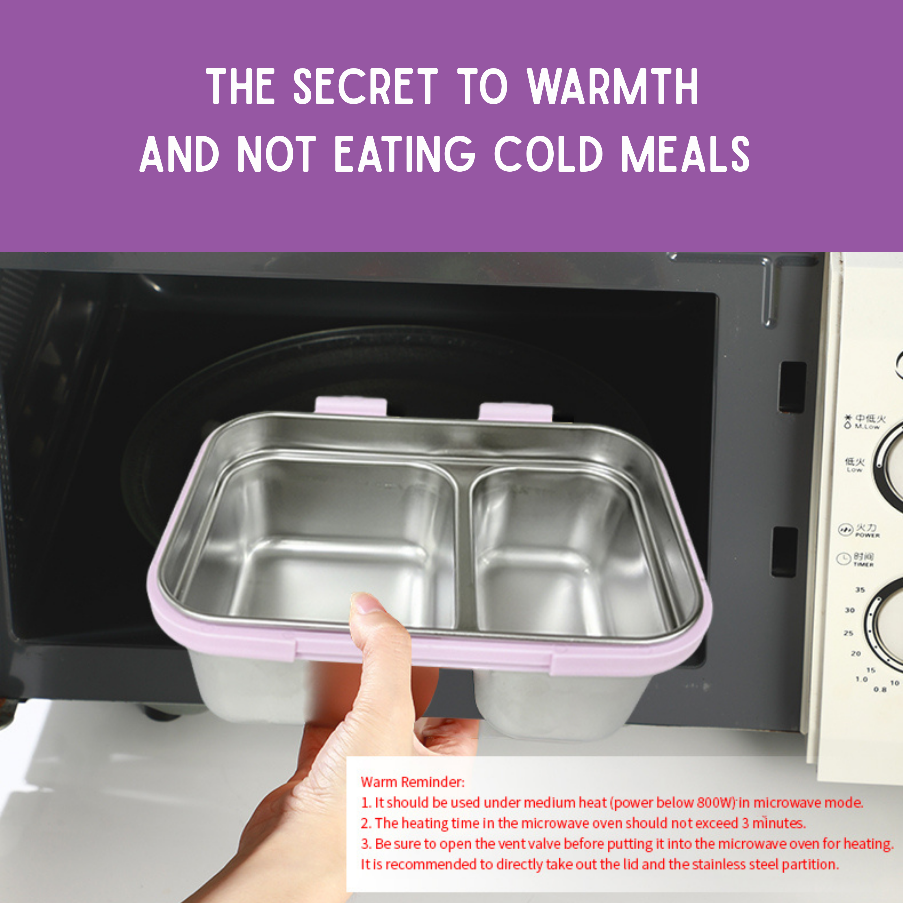The 2-compartment lunch box keeps meals fresh. Its stainless steel interior is microwave safe, making reheating easy and convenient.
