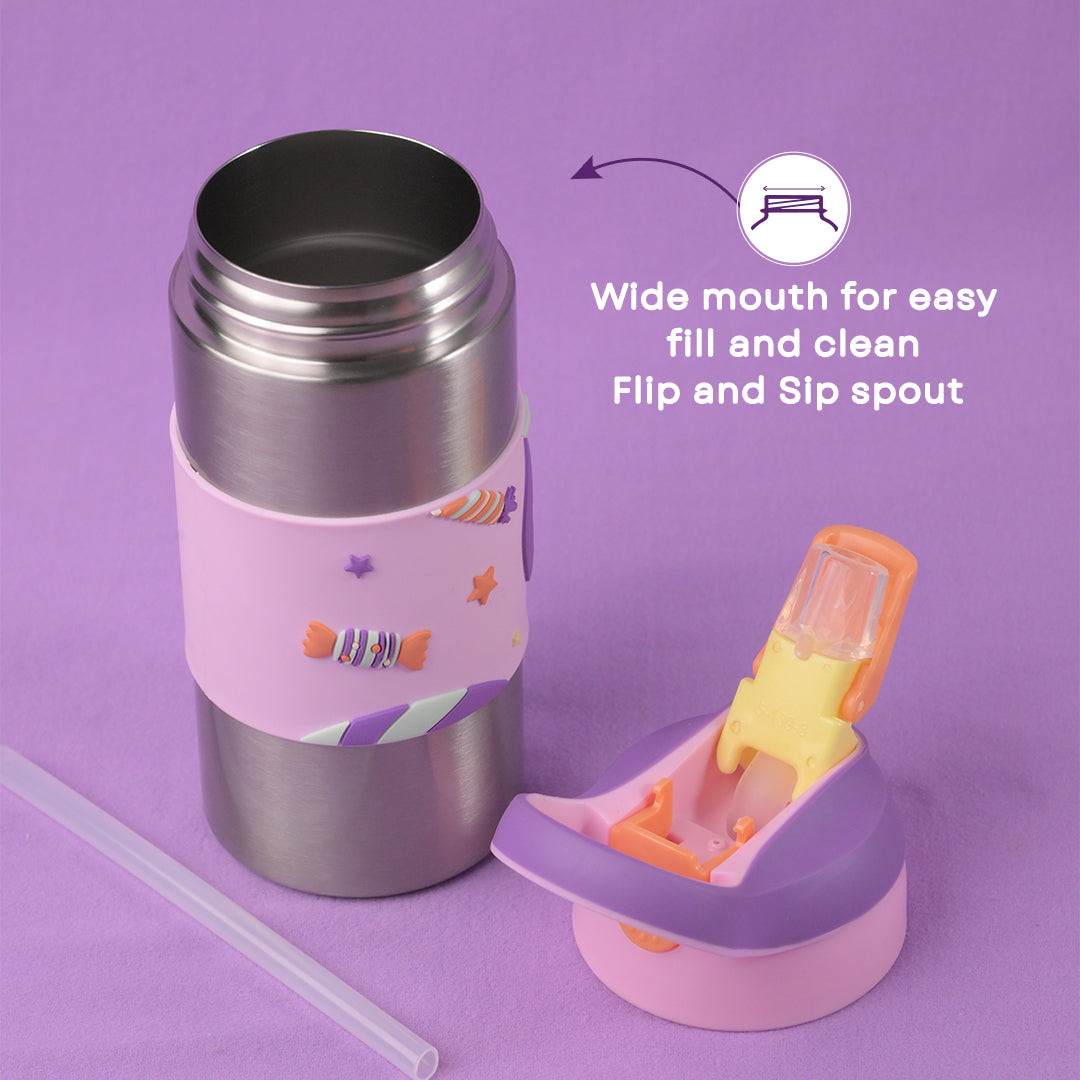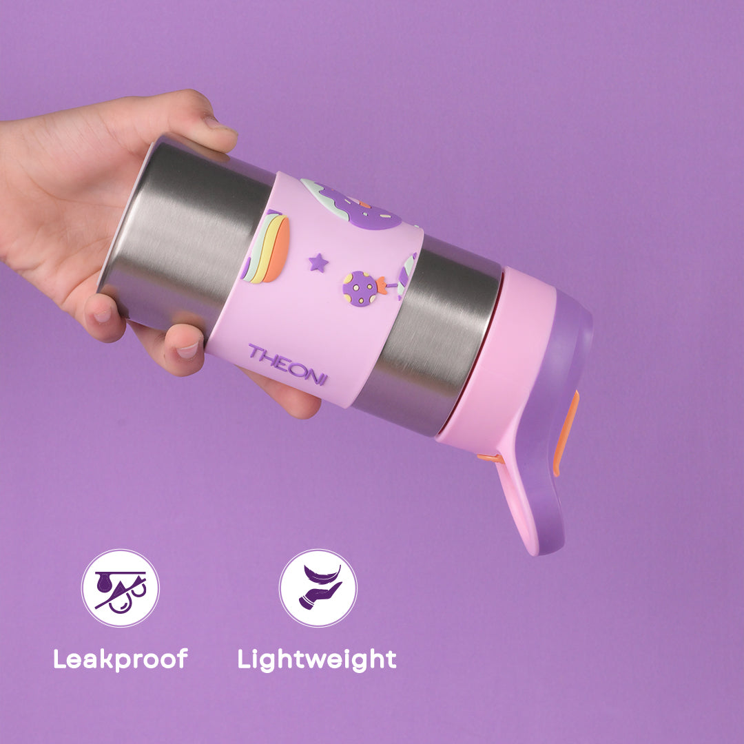 The water bottle is made from premium 304 food-grade stainless steel, is BPA-free, leak-proof, and features an easy-sip straw lid that encourages independent drinking. Lightweight and easy to carry, it fits perfectly into school bags.