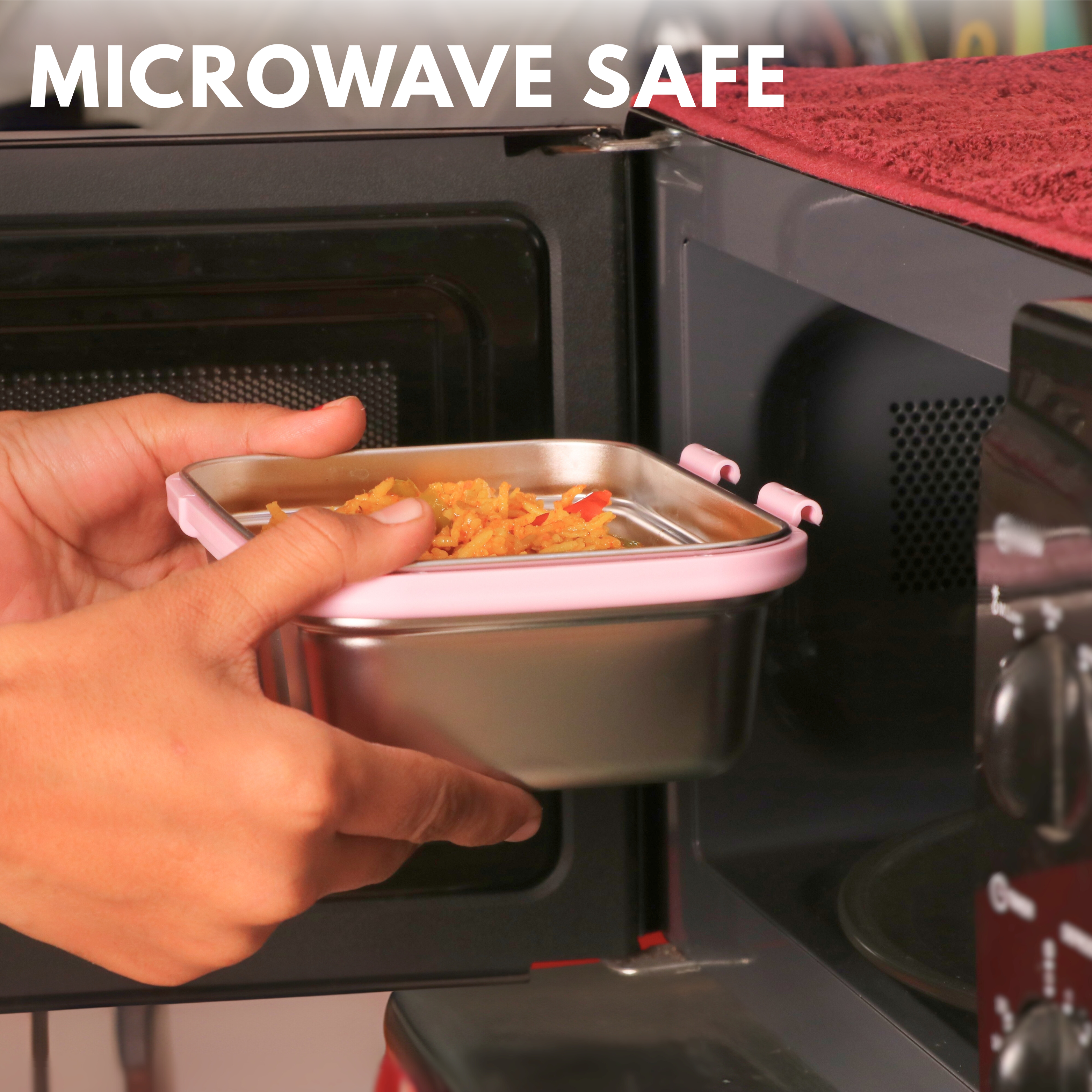 Yes. The Duo Steel Lunch Box comes with microwave-safe stainless steel bowls, allowing you to reheat food directly without transferring it to another container—perfect for busy school mornings and office use.