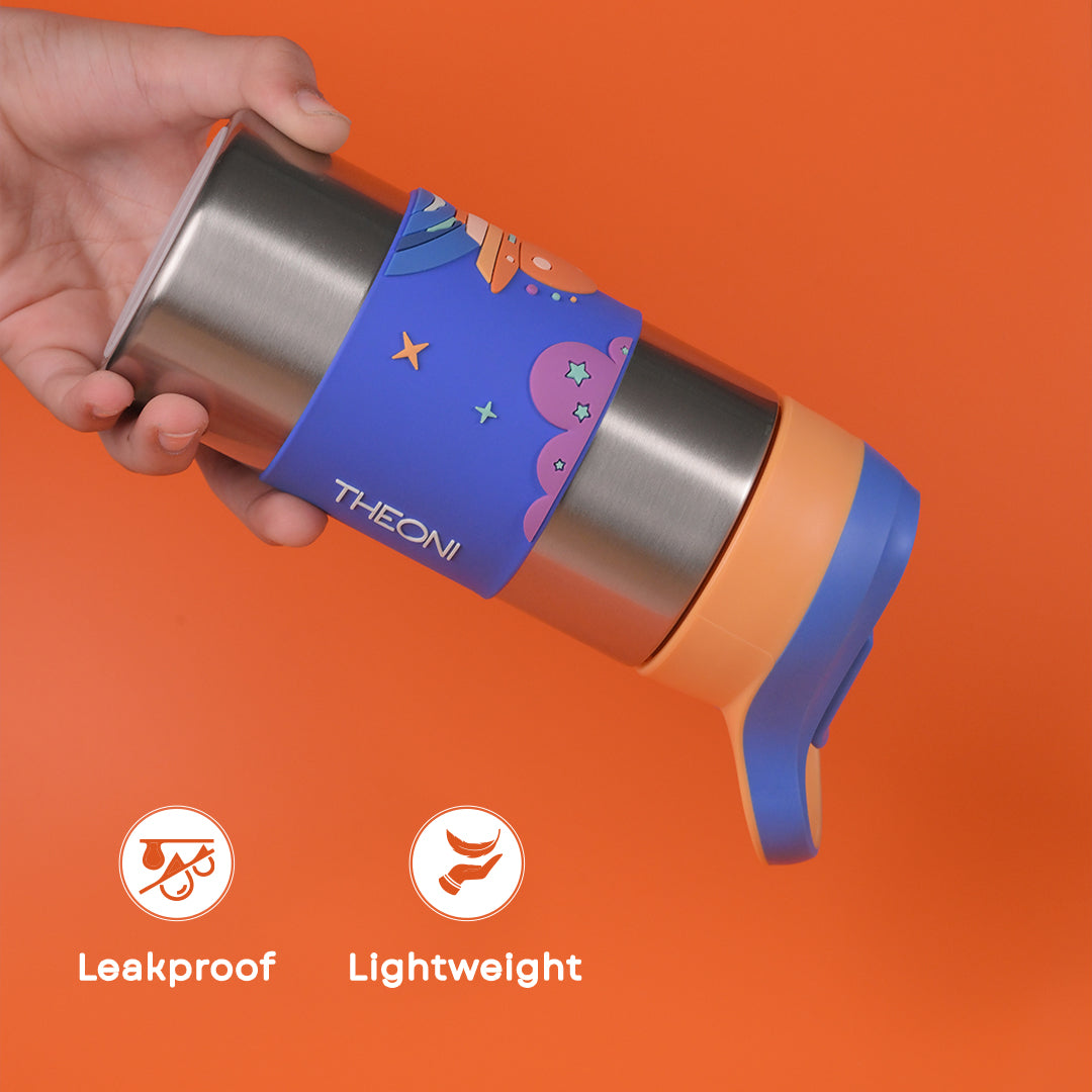 The water bottle is made from premium 304 food-grade stainless steel, is BPA-free, leak-proof, and features an easy-sip straw lid that encourages independent drinking. Lightweight and easy to carry, it fits perfectly into school bags.