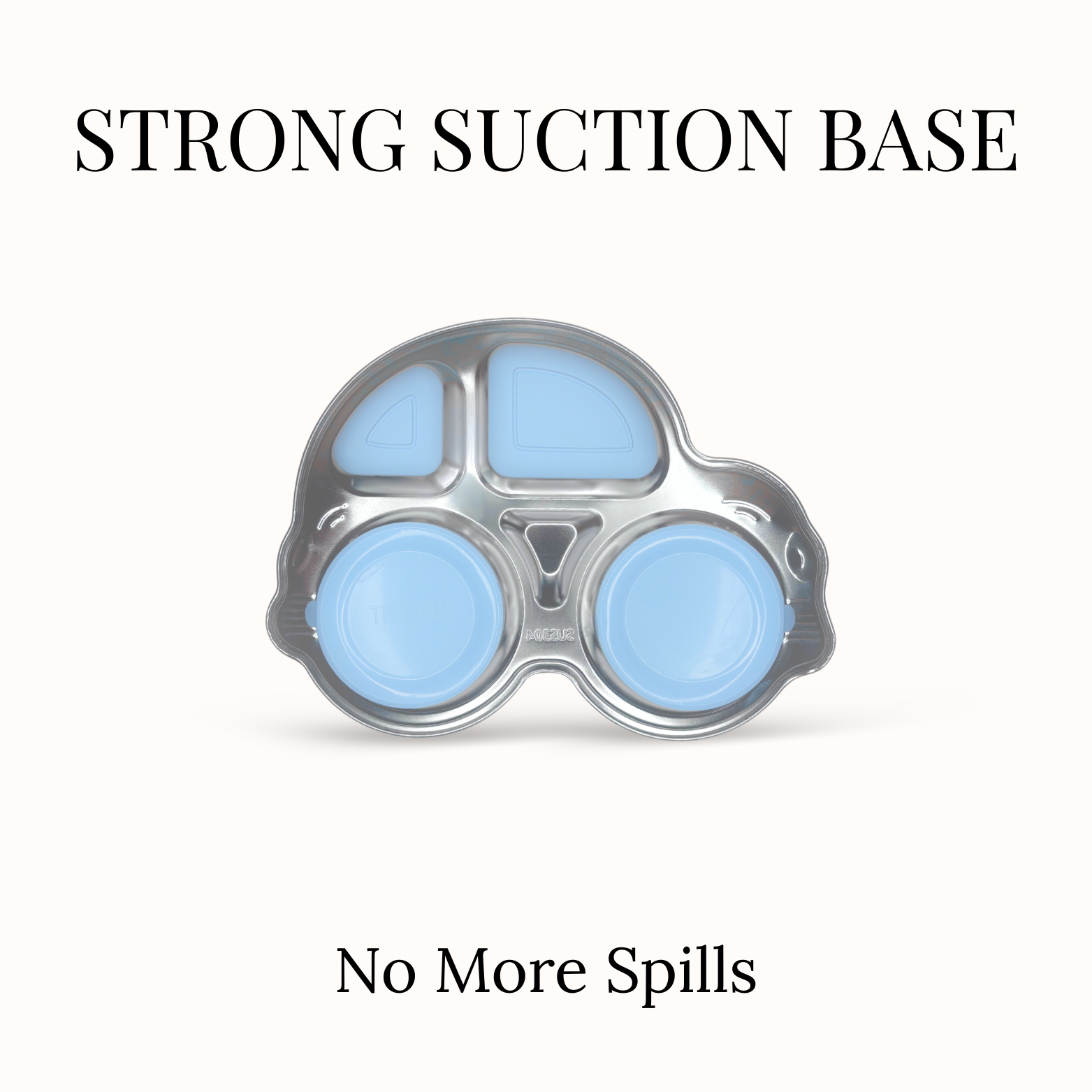 Theoni Stainless Steel Car Shape Suction Plate for Toddlers | 4 Section Kids Feeding Plate | BPA-Free & Dishwasher Safe - Personalization Available (Blue)