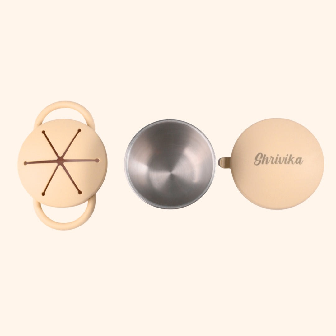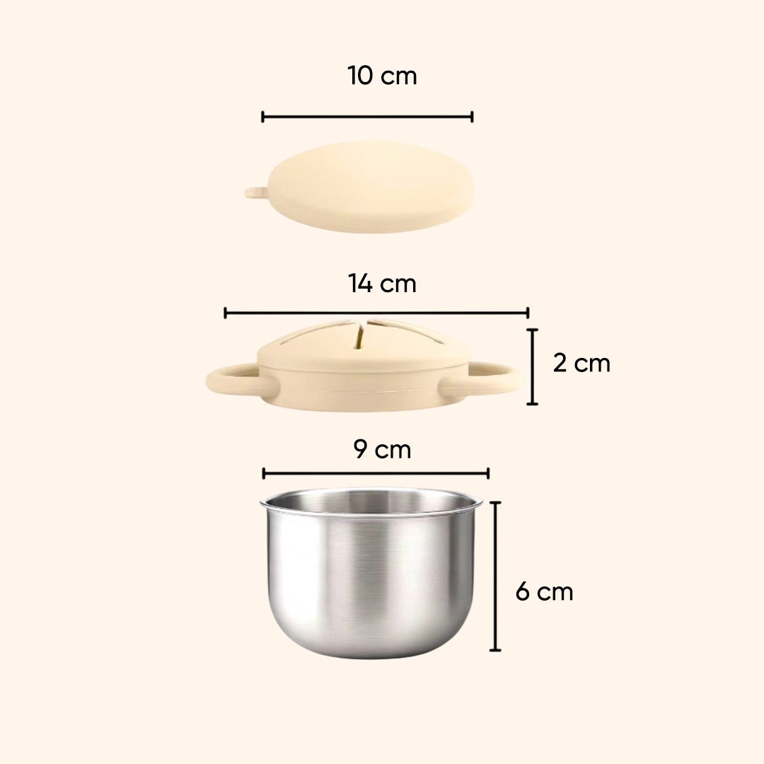 Theoni Stainless Steel Snack Cups with Removable Silicone Food Catcher & Travel Lid – Spill-Proof, Toddler-Friendly, Dishwasher Safe- Beige