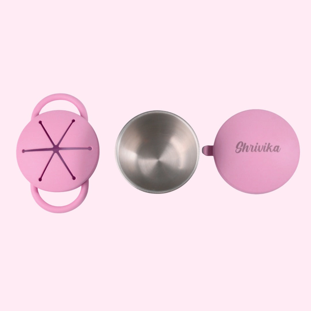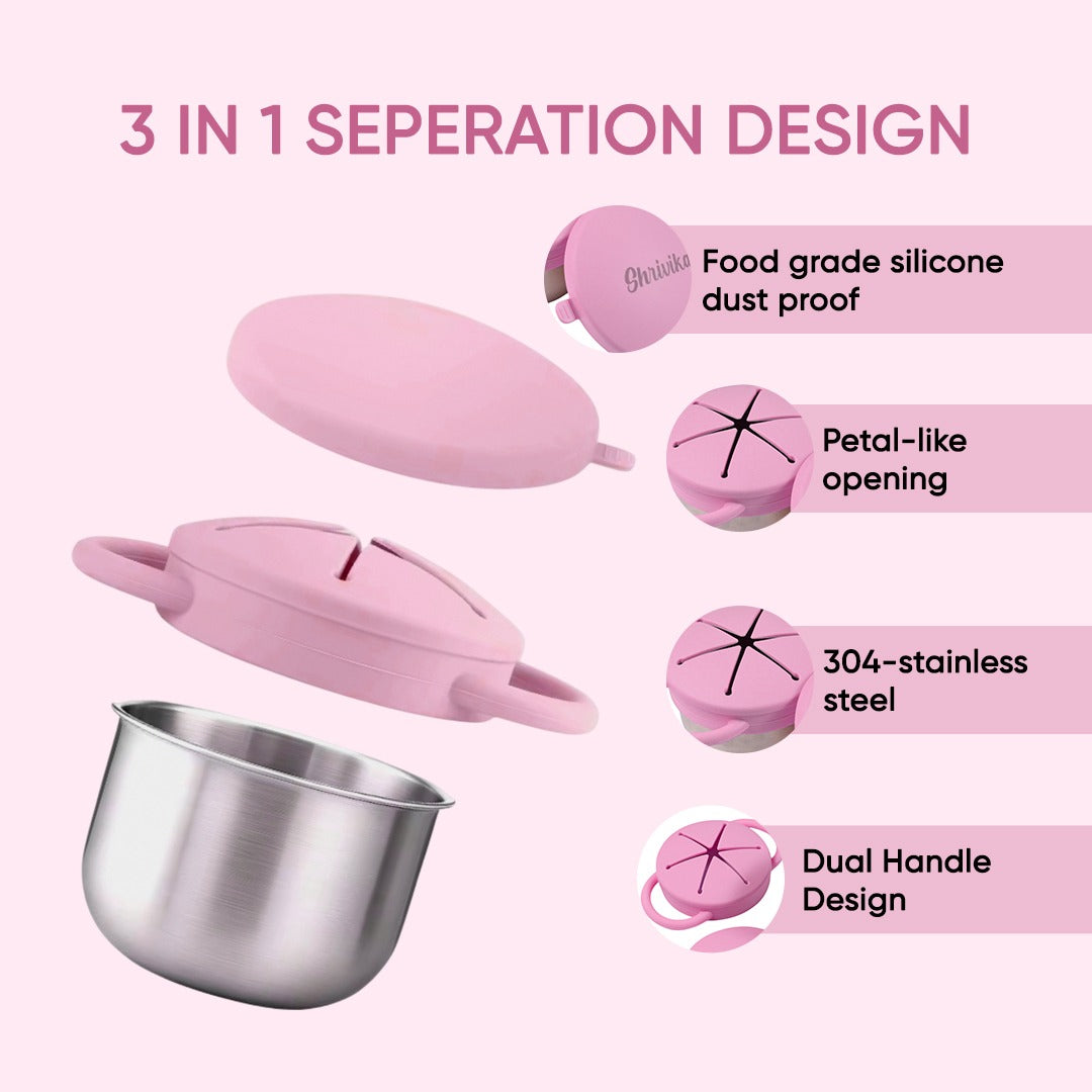 Theoni’s Stainless Steel Snack Cup is the ultimate spill-proof snack container for babies and toddlers. Designed with a soft, food-grade silicone petal lid, it allows easy snack access while preventing spills—perfect for little hands at home or on the go. Made from premium 304 Grade Stainless Steel, this toddler snack cup is durable, odor-resistant, and fully dishwasher safe.