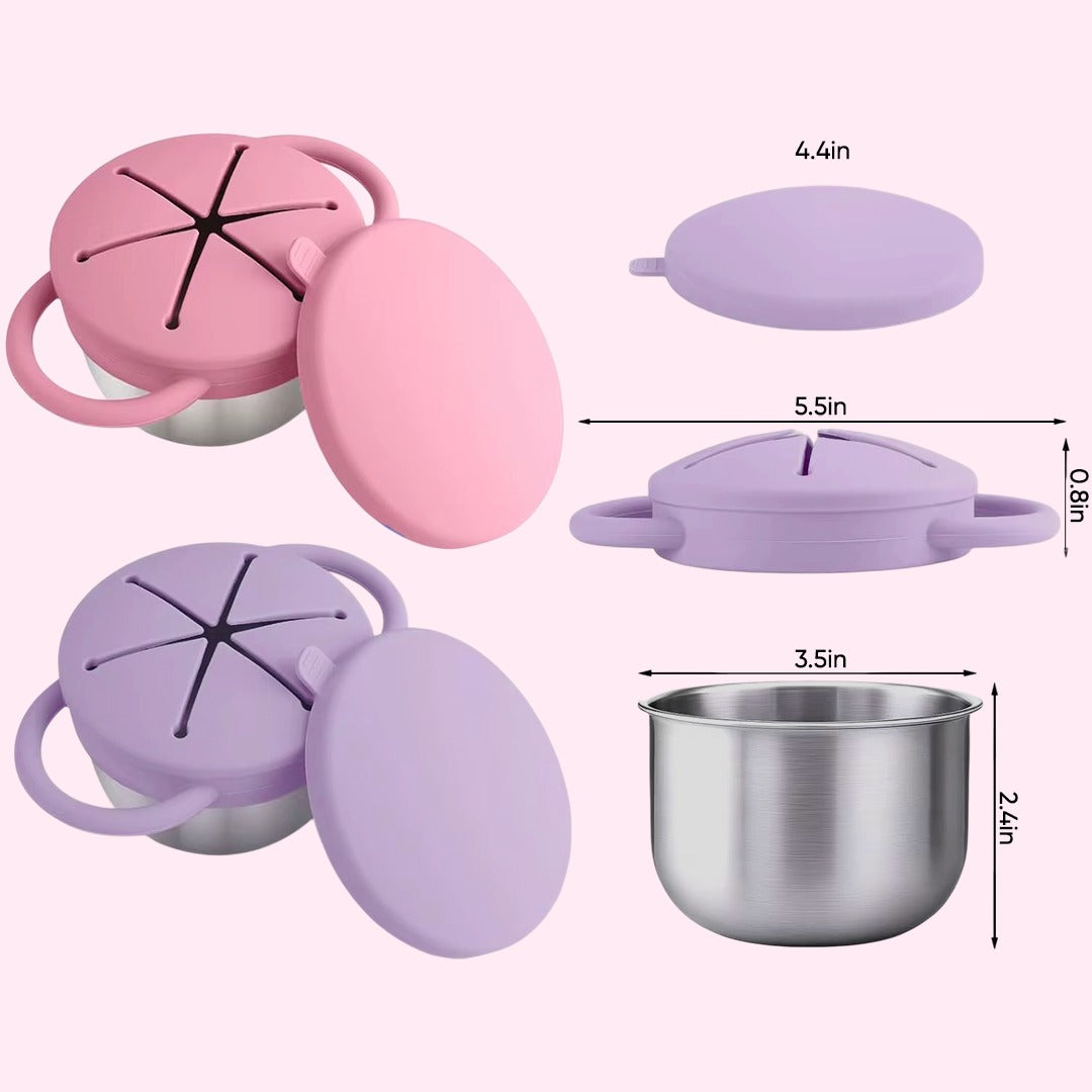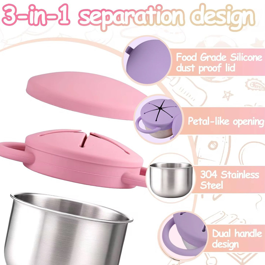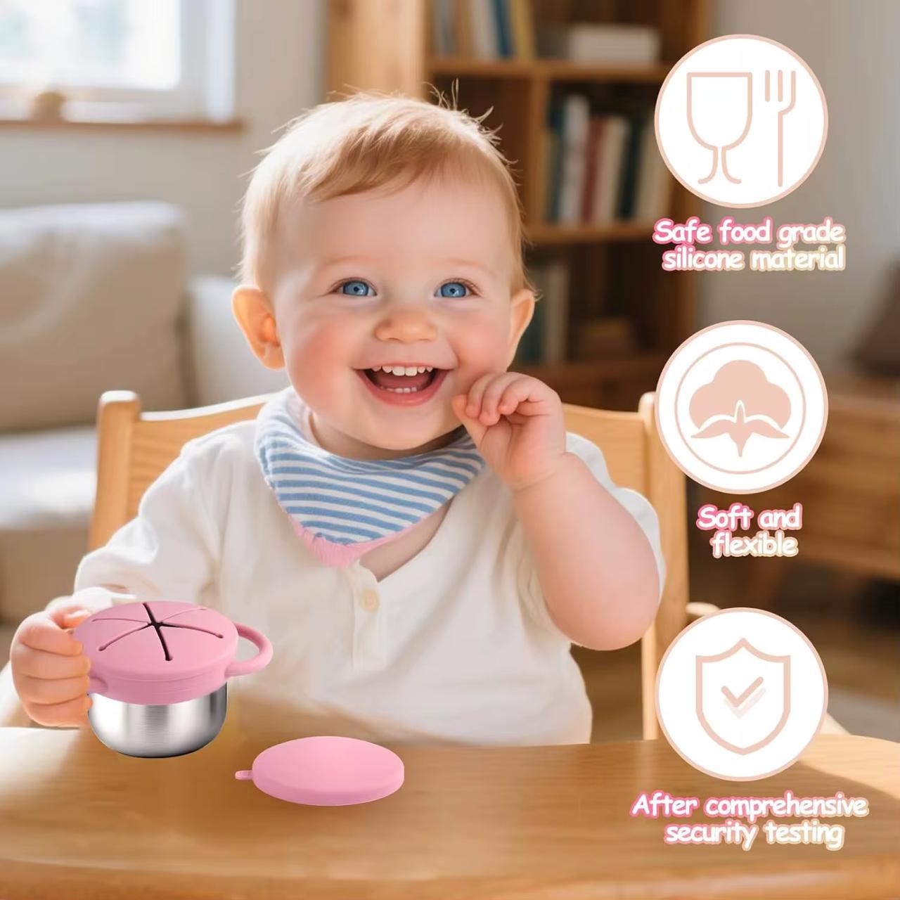 Theoni’s Stainless Steel Snack Cup is the ultimate spill-proof snack container for babies and toddlers. Designed with a soft, food-grade silicone petal lid, it allows easy snack access while preventing spills—perfect for little hands at home or on the go. Made from premium 18/8 stainless steel, this toddler snack cup is durable, odor-resistant, and fully dishwasher safe.